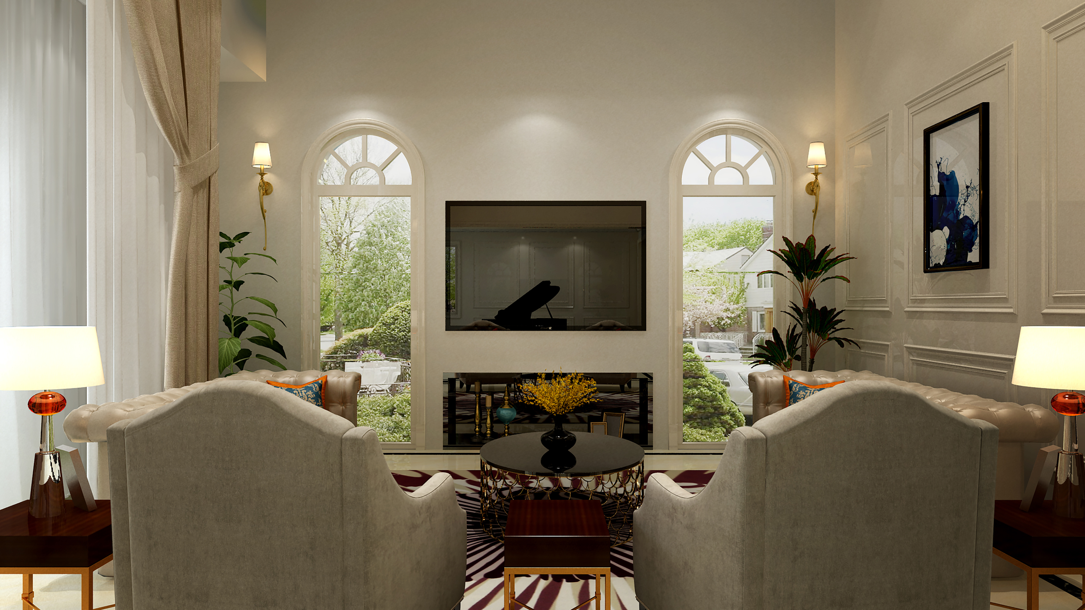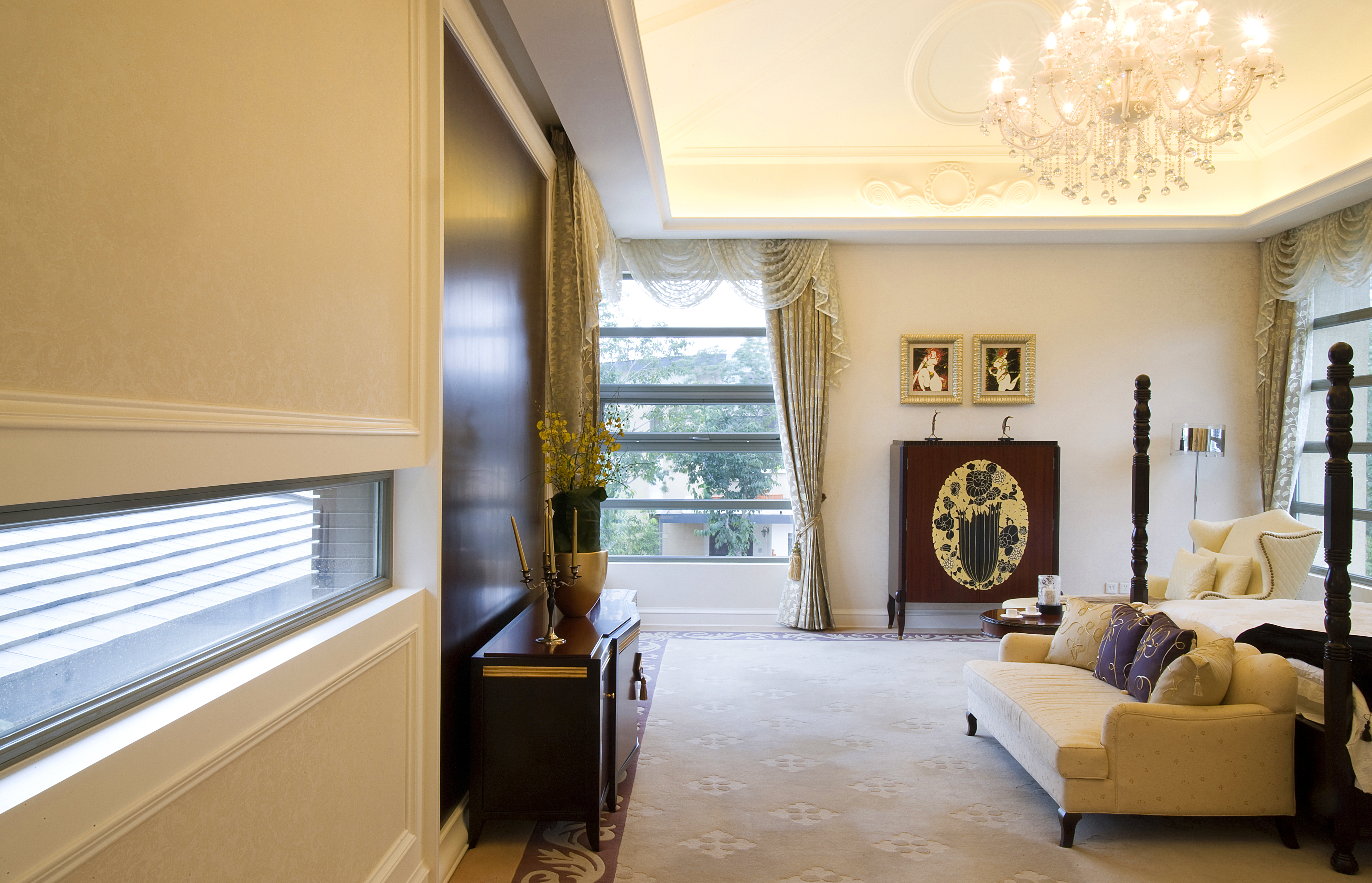 也可以用綠植或花器來點綴,如果是新古典風(fēng)格,可在落地飄窗處擺一把休閑單椅,配幾個靠包和一塊毛皮地毯即可。
