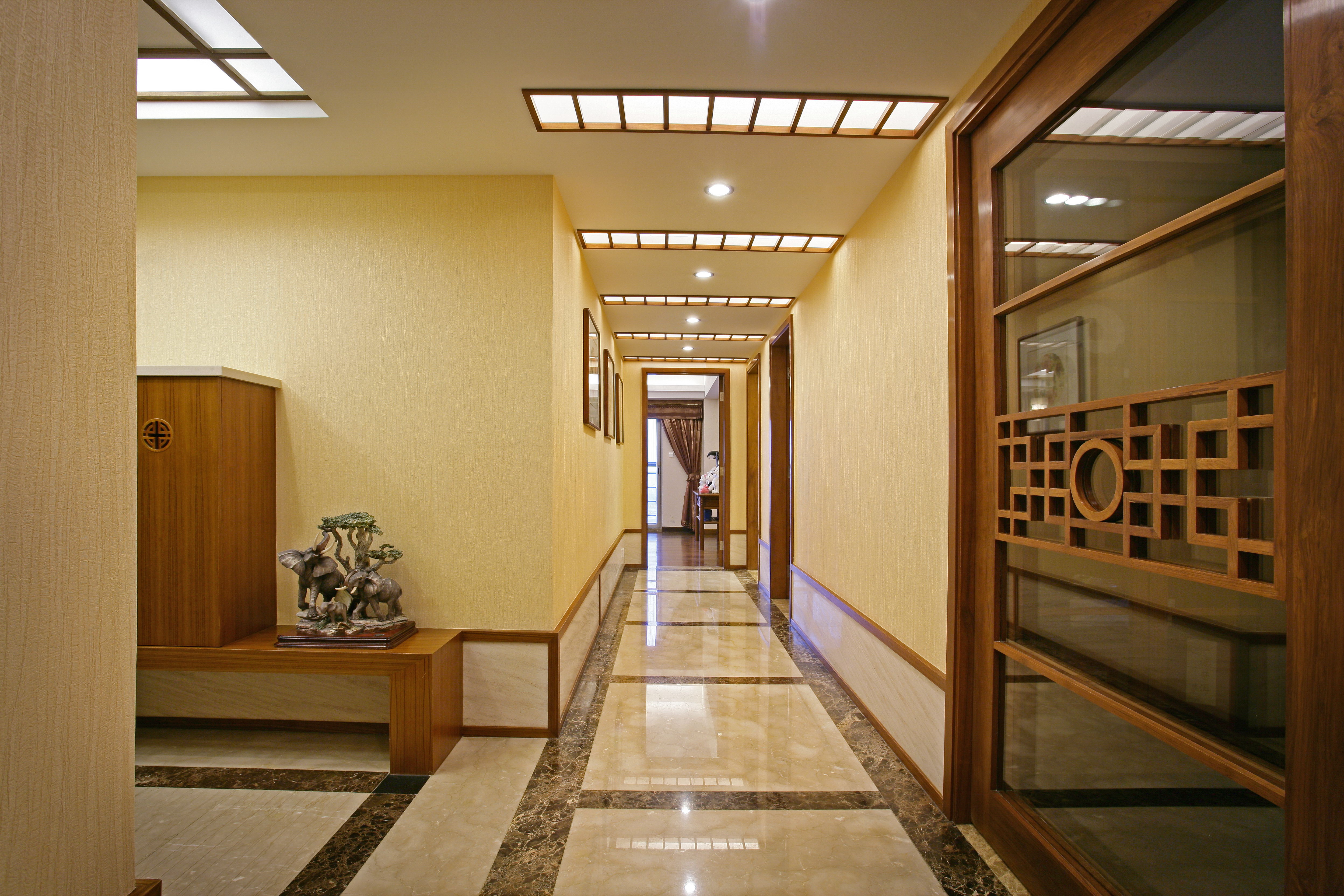 由于它的三個面都裝有玻璃,此處的日光還是比較充溢的,那么在裝飾質(zhì)材的選擇上就要多做考慮了。