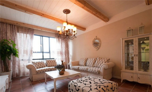 相比前面幾種歐式田園效果圖,這張效果圖更簡(jiǎn)單一些,淡紅色地磚搭配米白色的沙發(fā)設(shè)計(jì),給人一種自由、輕松的感覺。客廳中安裝的是落地窗,采光效果非常好,在靠窗的角落還擺放一盆綠色植物,給整個(gè)客廳增添一絲綠色生機(jī)。