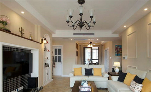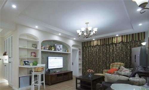 在這古典高雅的客廳中,體現(xiàn)出一種歐式田園風(fēng)格的氣息,客廳中采用簡(jiǎn)約白色沙發(fā)為主,搭配實(shí)木質(zhì)茶幾桌,地面又采用仿古式瓷磚拼花設(shè)計(jì),給人一種復(fù)古的味道。電視背景墻采用的是黑色瓷磚正方格子設(shè)計(jì),在客廳中顯得非常突出,深受人們的喜愛。