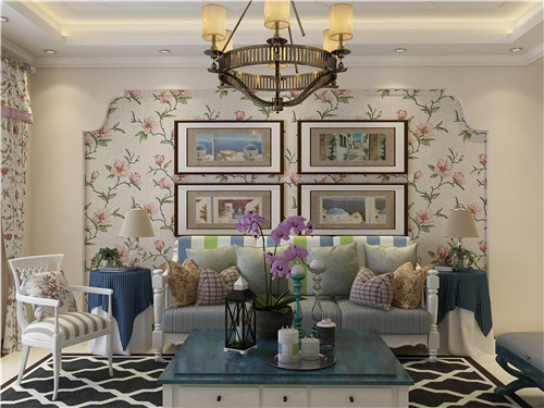 在這張客廳效果圖中,整體看起來非常雅致大方,處處體現(xiàn)著簡(jiǎn)歐田園風(fēng)光的味道。客廳中深藍(lán)色的柔軟沙發(fā),搭配深藍(lán)色碎花的電視背景墻再合適不過。客廳地面采用的也是藍(lán)色花卉圖案的地毯,既顯得高貴又復(fù)古。