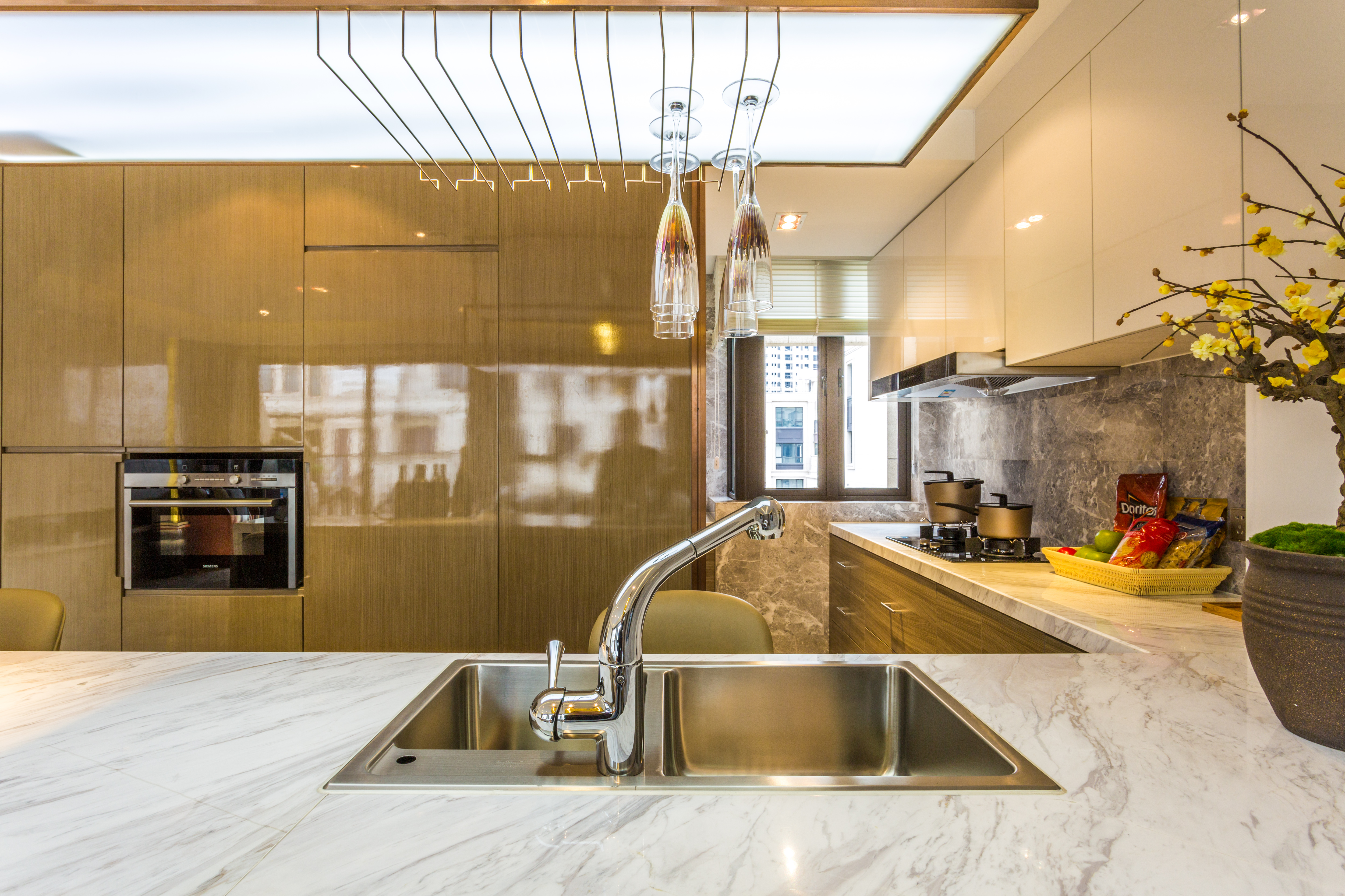 家里空間條件允許,一定要具備兩個(gè)洗菜盆,一大一小,洗碗和洗菜,可以兼具。同時(shí)還需要一個(gè)可以旋轉(zhuǎn)的水龍頭。能服務(wù)兩個(gè)水盆,方便使用。